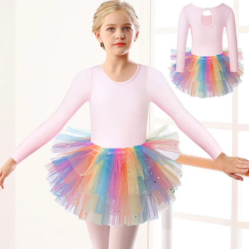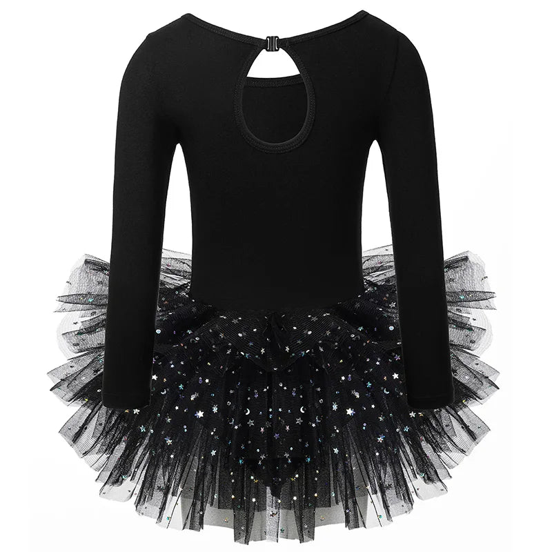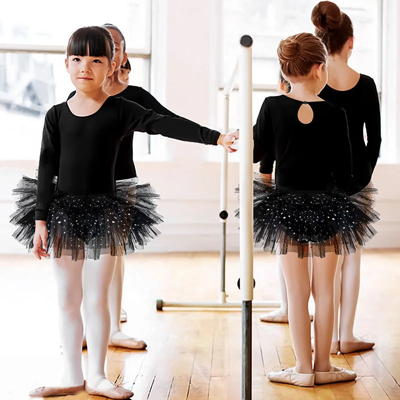 Girls Long Sleeves Tutu Dance Dress Ballet Leotard for kids Dance Practice with Glitter Sequin Design and Crotch Snap Skirt
