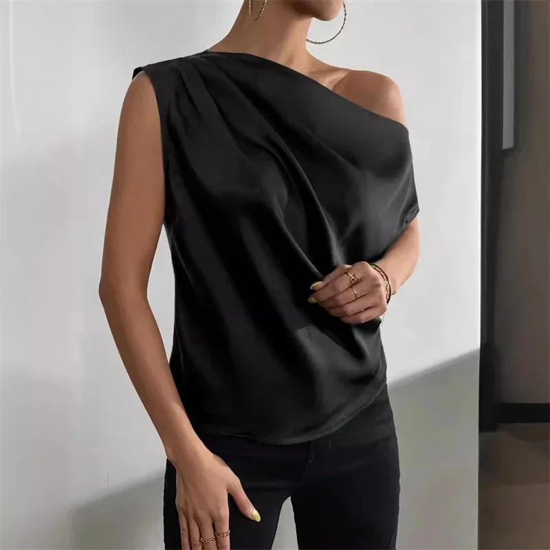 Women Summer Style Blouses Shirts Lady Casual Sleeveless Skew Collar Solid Color Blouse Tops