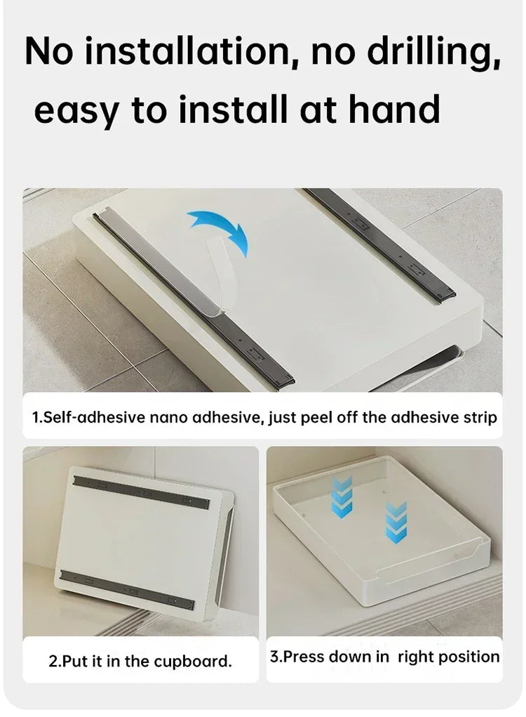 1. Easy to install: Our pull-out cabinet organizer is different from other sliding out drawers in that it does not require drilling or nailing, just stick the drawer onto the cabinet according to the manual, and installation can be completed within 1 minute.